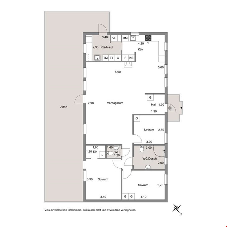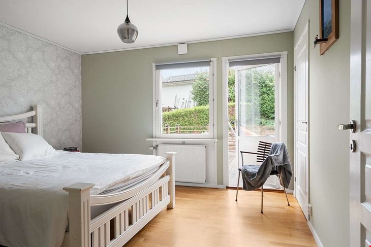 Bostaden rymmer fyra rum varav tre är sovrum. Huvudsovrummet har klädkammare och utgång till altanen.