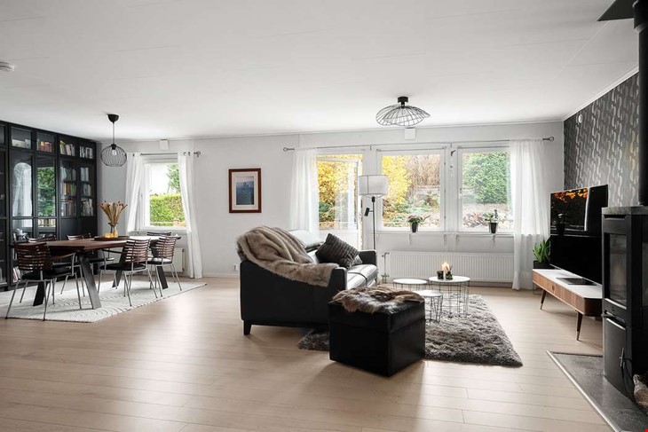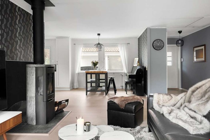 Vardagsrummet har stora fönsterpartier och gott om plats för både soffgrupp och matsalsbord. Här finns även en kamin som bidrar med extra värme. Från vardagsrummet nås altanen och tomten är 1 222 kvadratmeter stor.