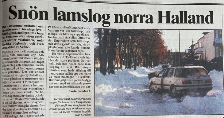 Strömavbrott drabbade många hushåll i flera dygn. En barnfamilj fick klara sig med levande ljus och vedeldning i två dagar. På E6:an mellan Kungsbacka och Varberg blev det totalstopp. Många bilister tvingades tillbringa sexton timmar i sina bilar sedan långtradare fastnat och plogbilarna inte kom fram.