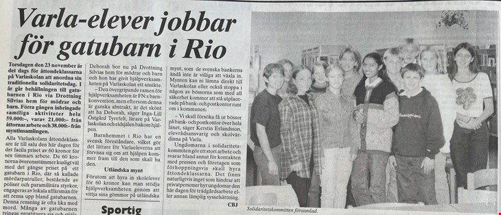 Åttondeklassarna på Varlaskolan anordnade sin traditionella solidaritetsdag. Det året gick insamlingen till gatubarn i Rio via Drottning Silvias hem för mödrar och barn. Många av barnen i Rio mördades, tvingades till prostitution eller hamnade i drogmissbruk.