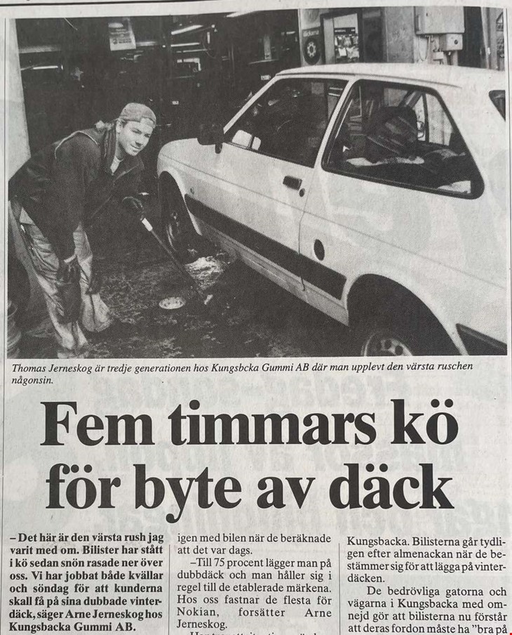 – Det här är den värsta rush jag varit med om. Bilister har stått i kö sedan snön rasade ner över oss. Vi har jobbat både kvällar och söndag för att kunderna skall få på sina dubbade vinterdäck, sa Arne Jerneskog hos Kungsbacka Gummi AB.