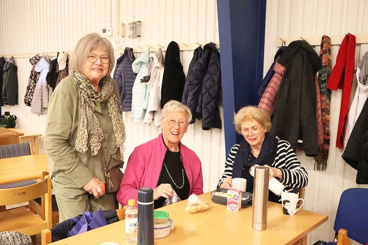 Fikapaus. Ragnhild Siöström, Laila Kiviharju och Berit Söderbaum är nöjda med dagens spel och avslutar med en pratstund över medhavd fika. Foto: Jenny Segergren.