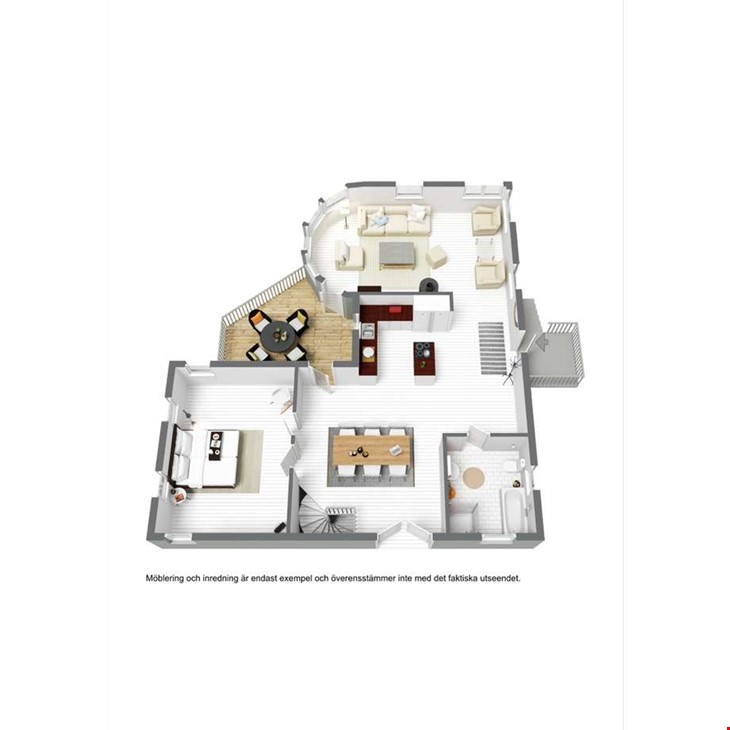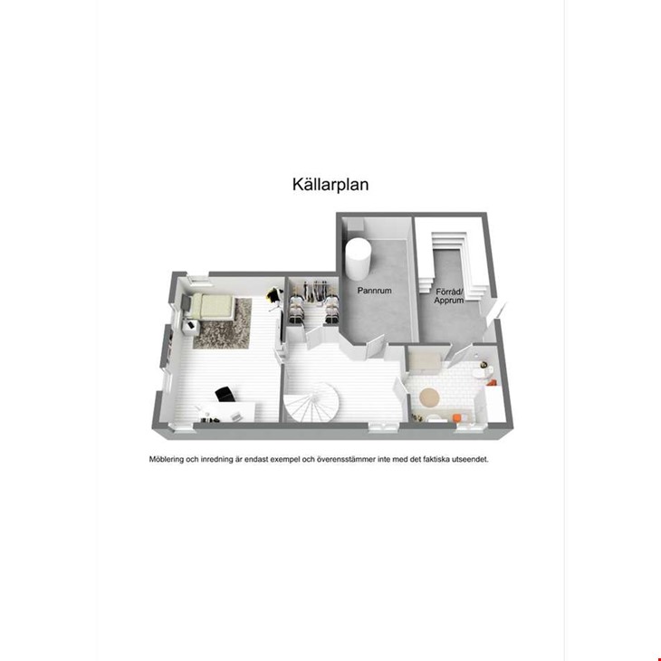 Nedre plan nås via en spiraltrappa. Våningsplanet är ännu inte färdigställt när det gäller ytskikt, utan är byggt i grova drag.