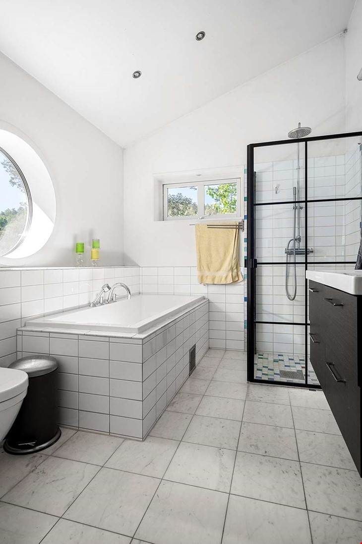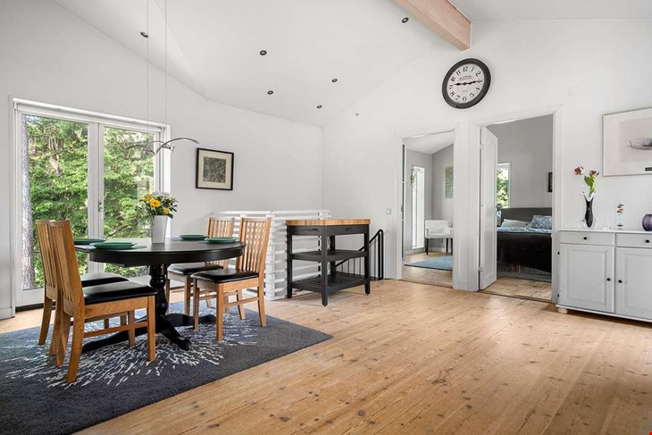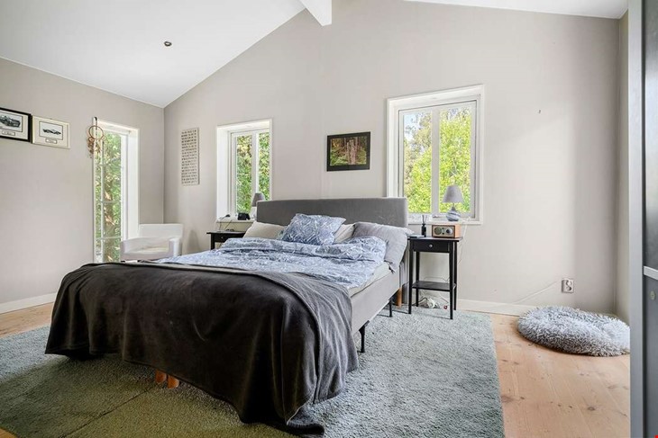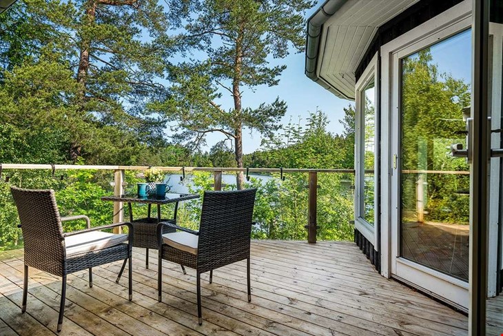 Entréplanets sovrum har under senare år byggts om från två rum till ett. Från matsalen leder en helglasad altandörr ut mot balkongen, med utsikt över både sjön och grönskan.