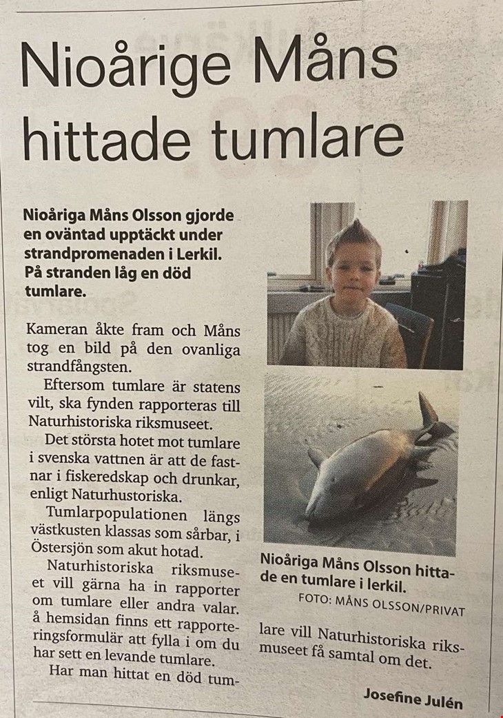 Nioårige Måns hittade en tumlare under en strandpromenad i Lerkil och tog en bild på det ovanliga fyndet.