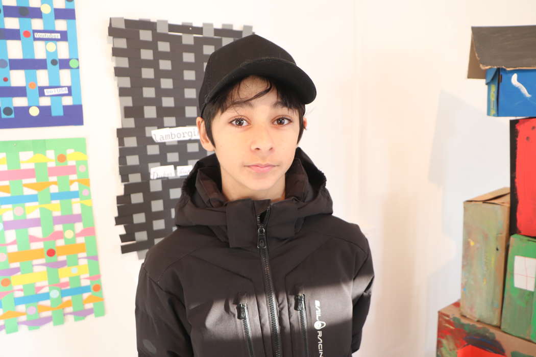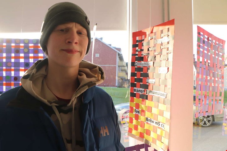 – Jag vill resa till Italien och ha en Lamborghini, säger Isak Josefsson när han står vid sitt konstverk som går i svarta och gråa färger.