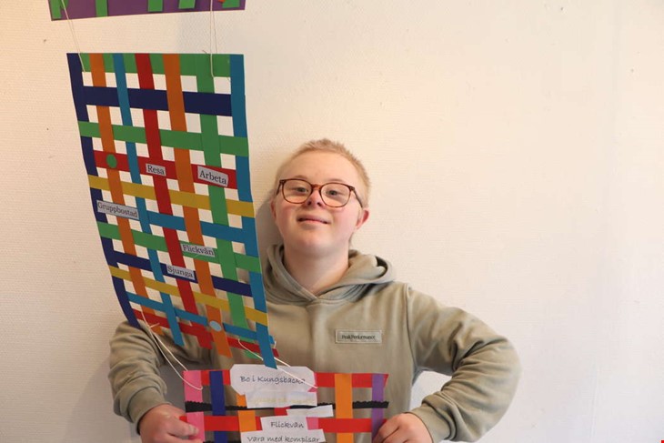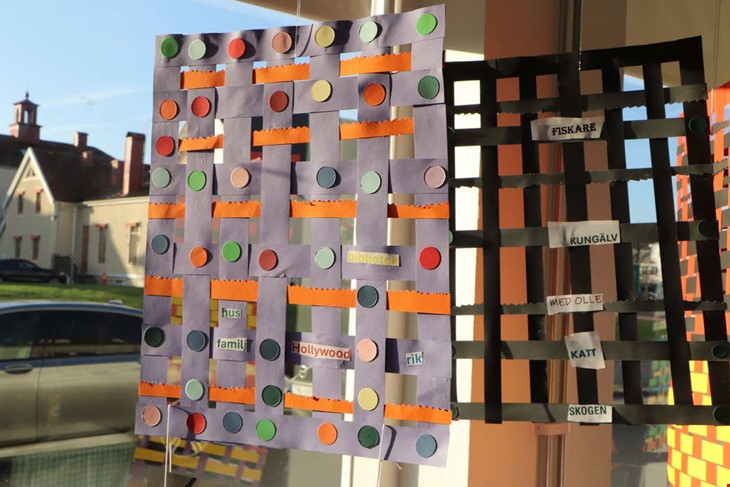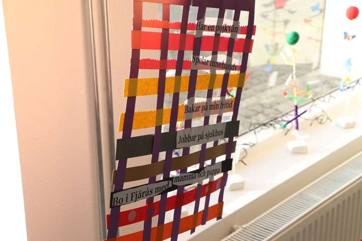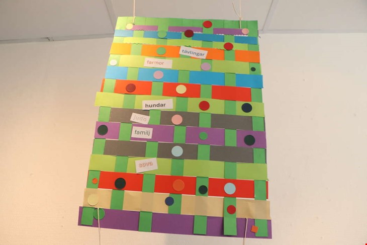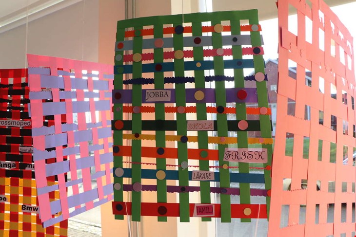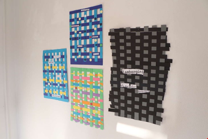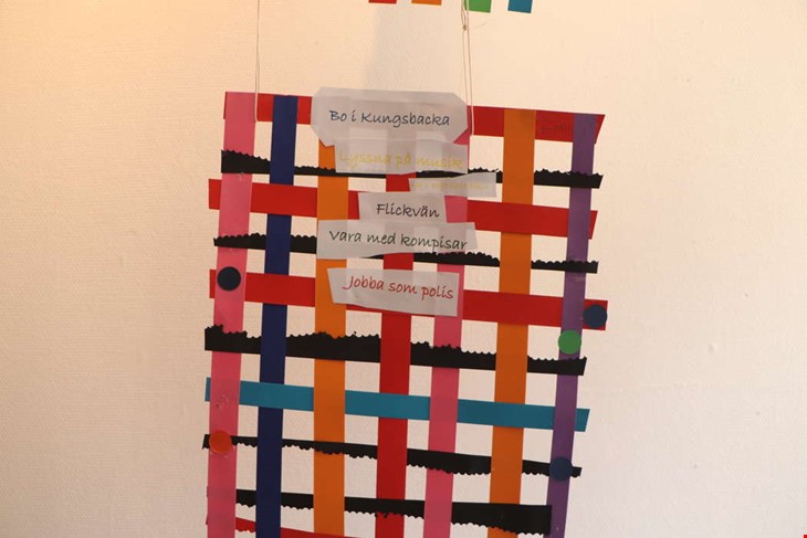 I lokalen hänger färgglada pappersverk där korslagda remsor bildar täta mönster. På dem syns ord som judo, arbeta, sjunga, resa, lön, läkare, familj, laga mat till poliserna, fiskare, skogen, sminkaffär och flickvän. Eleverna har arbetat med verken under terminen inför utställningen "Min framtid" som invigdes i Galleri 53 på måndagen.