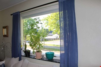 Att vi behållit fönsterbågarna och fått dem rena från plastfärg, tycker hon också är ett plus. När vi köpte huset var de bruna, nu engelskt röda och målade med linoljefärg.