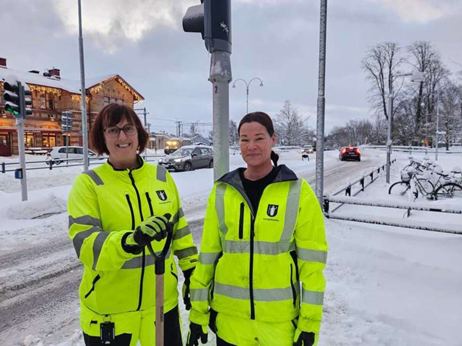 Ingela och Frida på Kungsbacka kommun var några av dem som skottade snö under onsdagsmorgonen. Trots intensivt arbete var de positiva.
