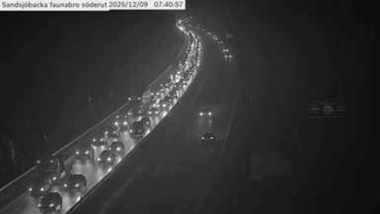 Klockan 07.40 finns det inte längre något hinder på vägen men köerna sträcker sig mellan Varla och Sandsjöbacka.