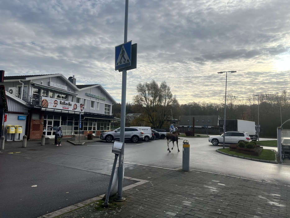 När Madeleine Oom Wahlberg lastade in matkassarna i bilen reagerade hon plötsligt på ett ljud. Det var en älg som sprang genom Kullaviks centrum.