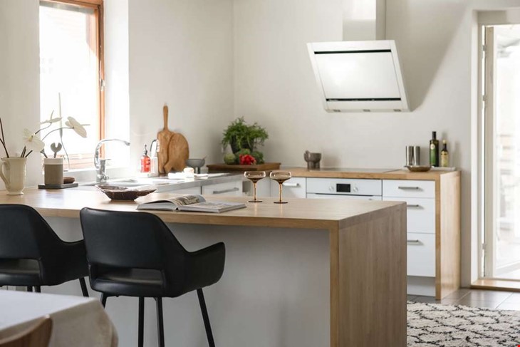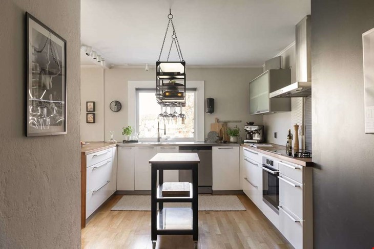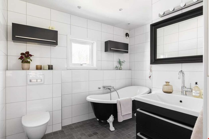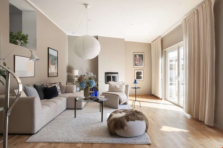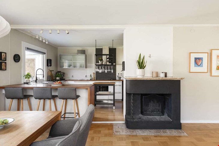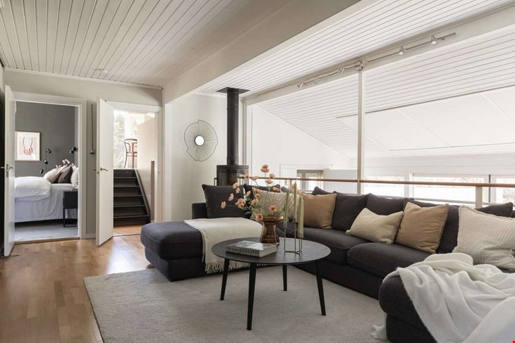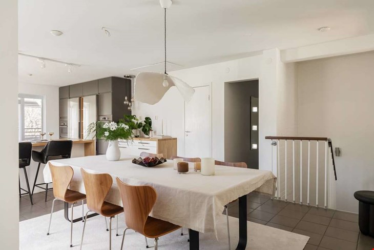 I första bostaden går köksinredningen i vitt med bänkskivor i ek. Köket ligger i direkt anslutning till matsalen, som har plats för femton personer. Härifrån nås altanen med glastak. I vardagsrummet finns även en braskamin för värme och trivsel. På mellanplanet finns ett vardagsrum/lounge med skjutdörrar till altanen.