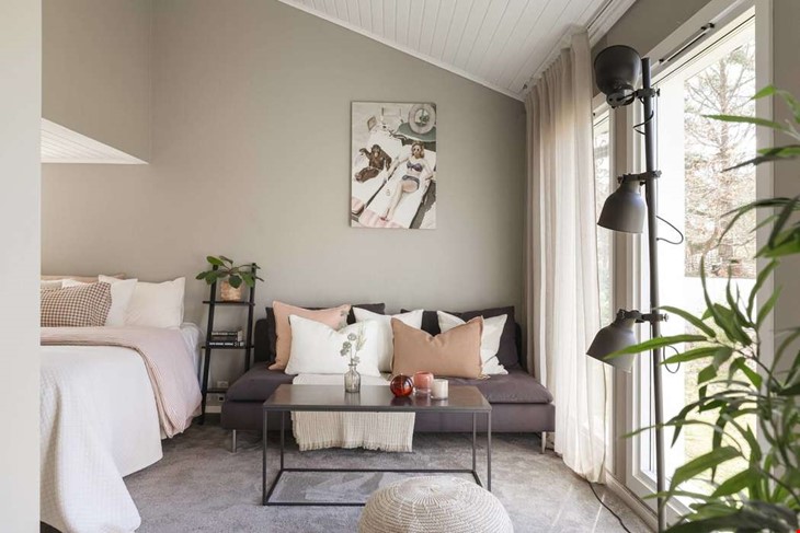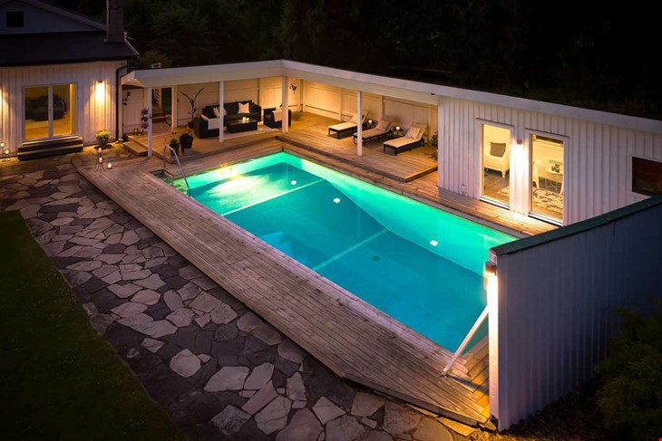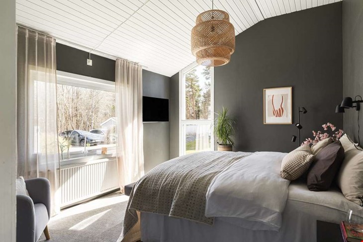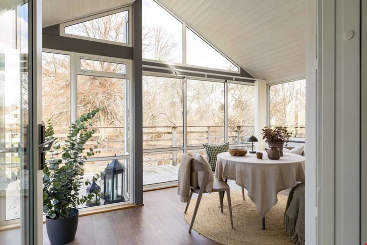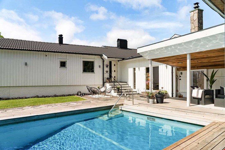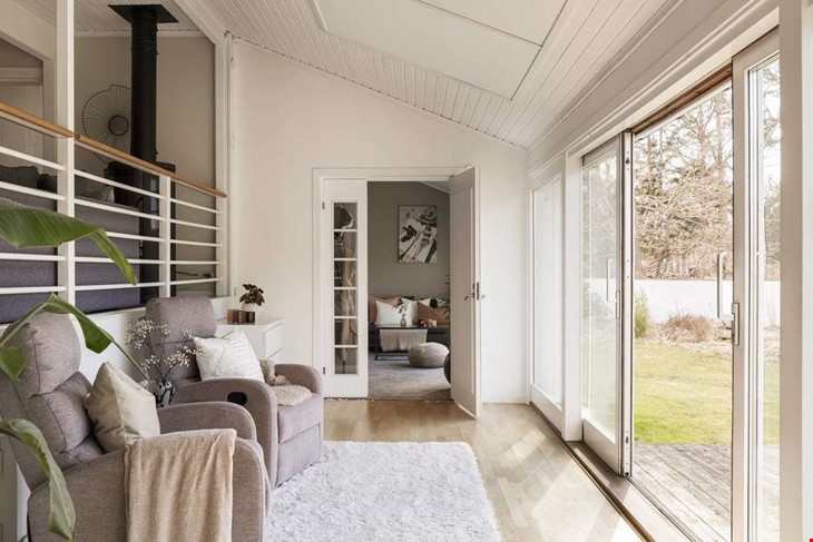 I den andra bostaden är köket rymligt och har dörrar som leder ut till uterummet med isolerat golv och tak. I vardagsrummet sprider eldstaden värme, medan altandörrarna leder ut till poolområdet. På källarplan finns flera sovrum och ett badrum.
